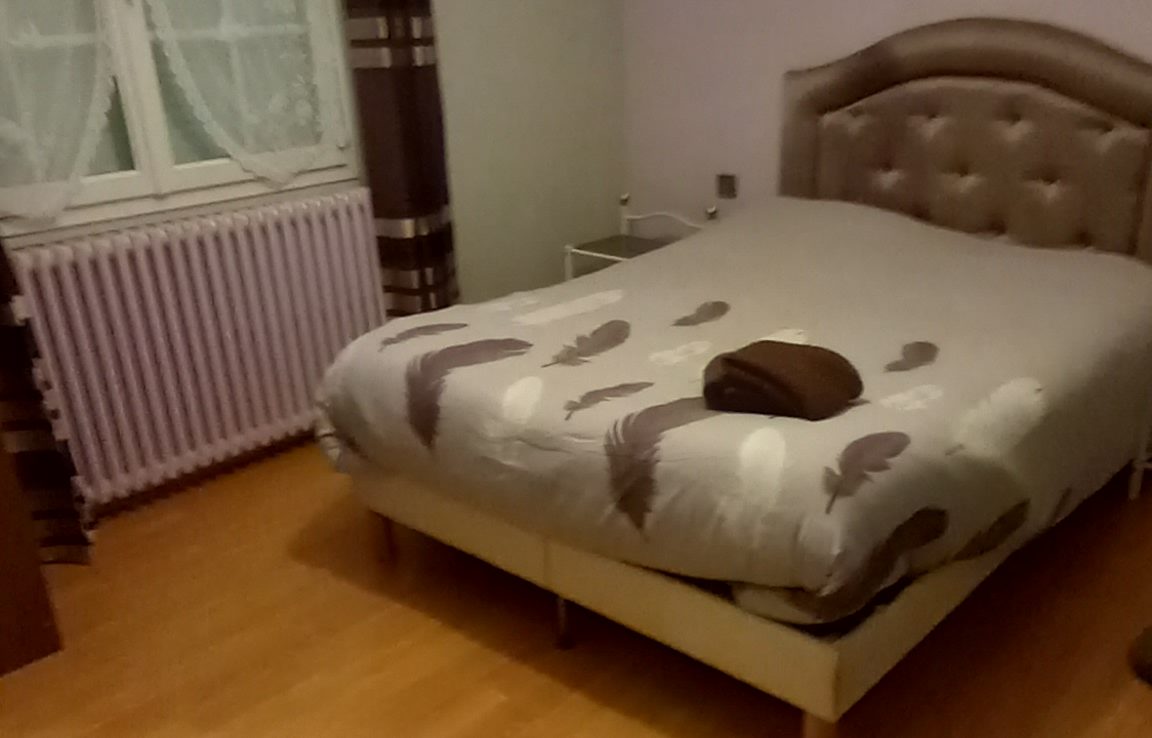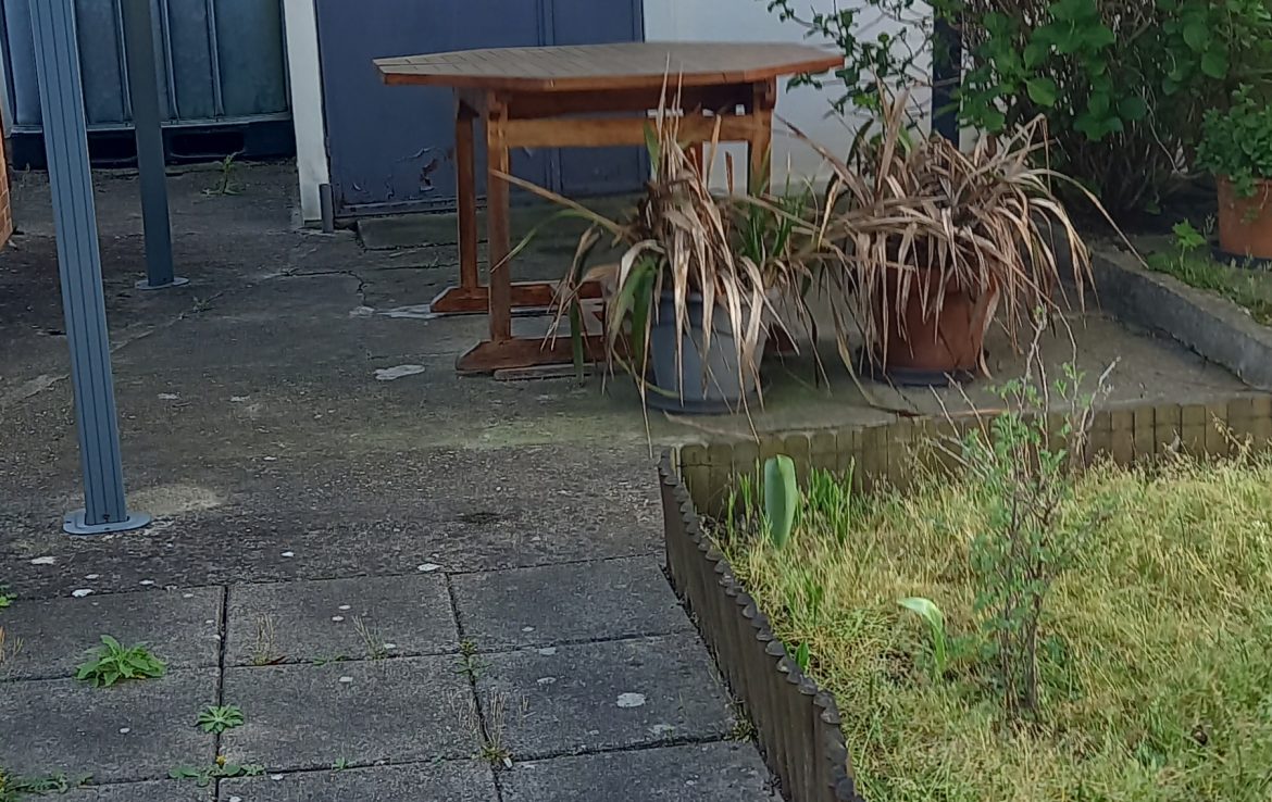 Maison plain-pied 74 m² sur 365 m² de jardin clos arboré : cuisine E/A, séjour, 2 chambres, WC ind., salle de douche, bureau, cave. A l’extérieur : garage, dépendance, ch. Gaz.